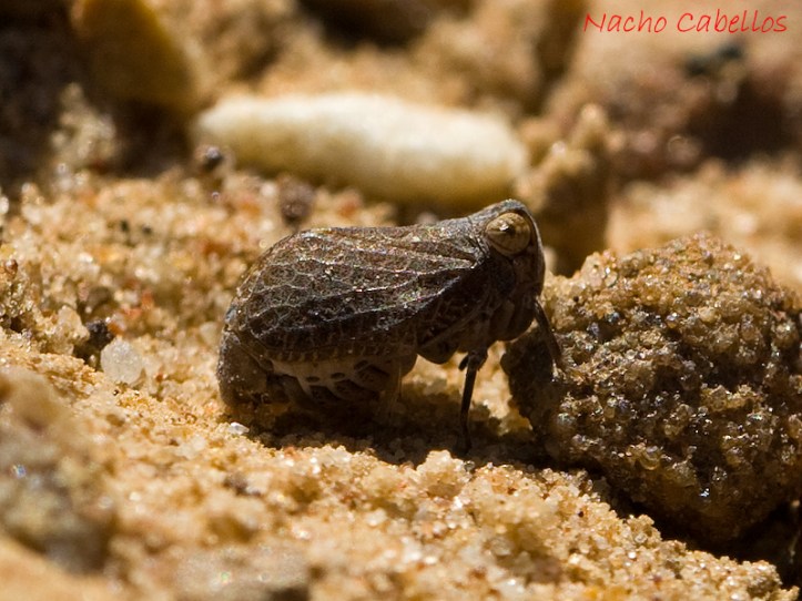 Un interesante y diminuto hemíptero, de la familia Issidae, bastante difícil de ver (al menos para mí), ya que mide unos 5 o 6 mm, y estaba perfectamente camuflado en el camino