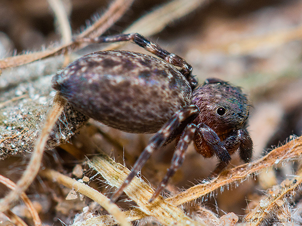 Araña saltadora (Salticidae) de tamaño medio (de 3,5 a 4 mm los machos y de 4,2 a 6,7 mm las hembras), que habita en suelos pedregosos y se alimenta principalmente de otras arañas (también caza insectos). El macho es muy vistoso con colores rojizos en el prosoma y bandas blancas en el opistosoma y patas, mientras que la hembra tiene una coloración bastante más discreta.