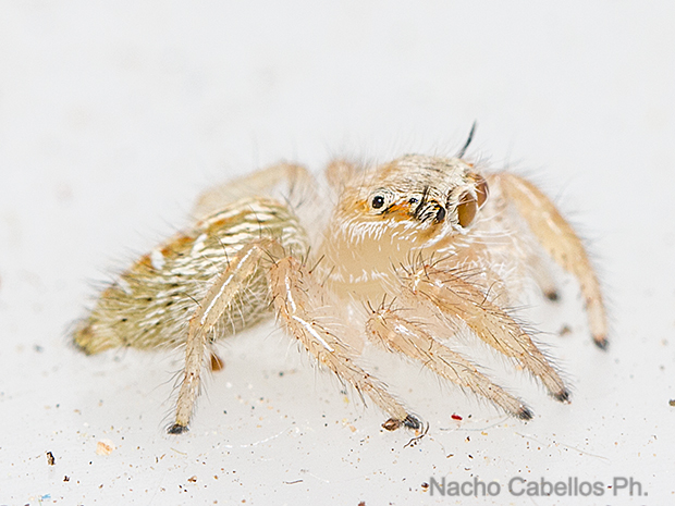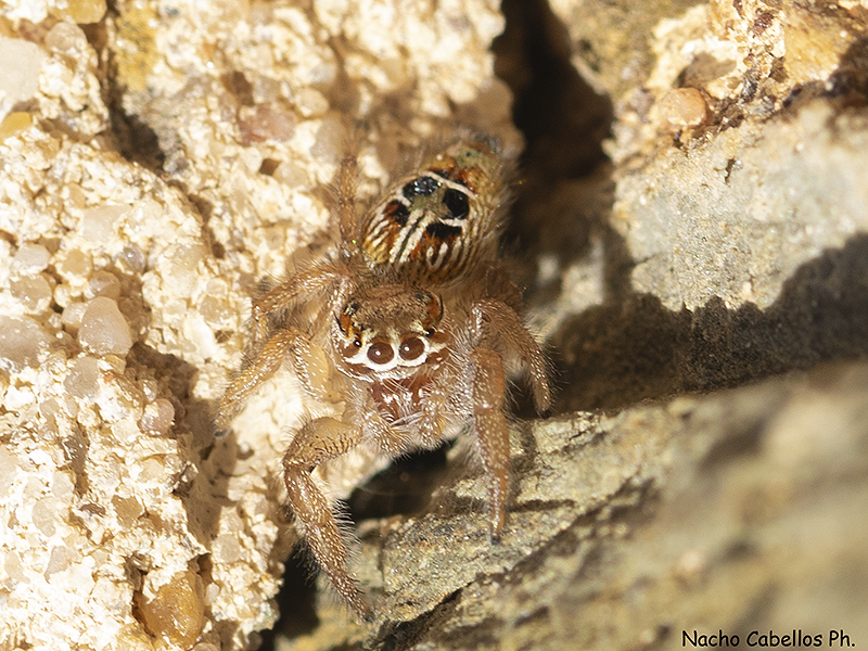 Araña saltadora (Salticidae) de tamaño mediano, bastante común, caracterizada por la coloración general clara, las manchas oscuras a ambos lados del opistosoma con brillos metálicos en los machos, abdomen ahusado y dos característicos mechones de pelo negro a ambos lados de los ojos frontales.