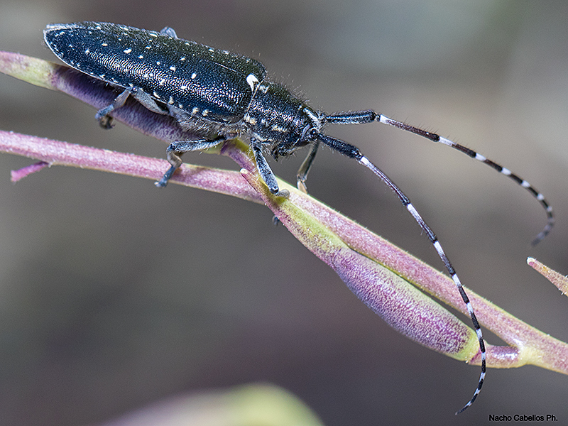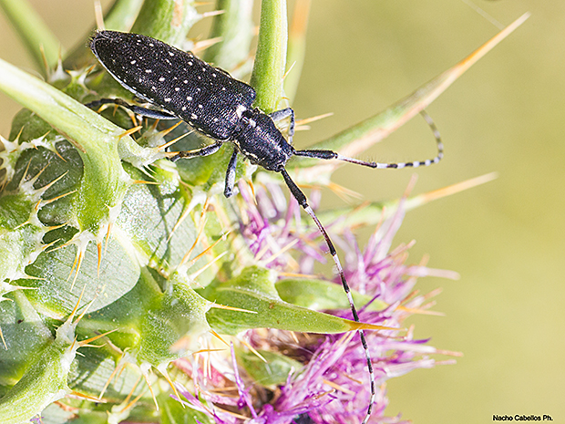 Coleóptero (escarabajo) cerambícido (de los llamados «longicornios», y «longhorn beetles» por los angloparlantes) perteneciente a la subfamilia Lamiinae y caracterizado por presentar una longitud entre 13 y 21 mm, una coloración azul metálico muy oscuro, prácticamente negro, y recubierta por una pubescencia oscura; cabeza con una banda de tomento claro longitudinal; antenas con una longitud casi doble de la del cuerpo en los machos, y algo más cortas proporcionalmente en las hembras, con los dos primeros artejos negros, y los siguientes de un tono rojizo, anillados de tomento claro en la base. El protórax es bastante cuadrado, y presenta dos bandas laterales de tomento claro; a veces también presenta una banda central, que no tiene por qué ser completa, y aparece como continuación de la de la cabeza. Todo el cuerpo está fuertemente punteado; los élitros son subparalelos, y están levemente acuminados en el ápice; pueden ser completamente oscuros, pero lo normal es que presenten manchas de tomento claro dispersas o algo alineadas.