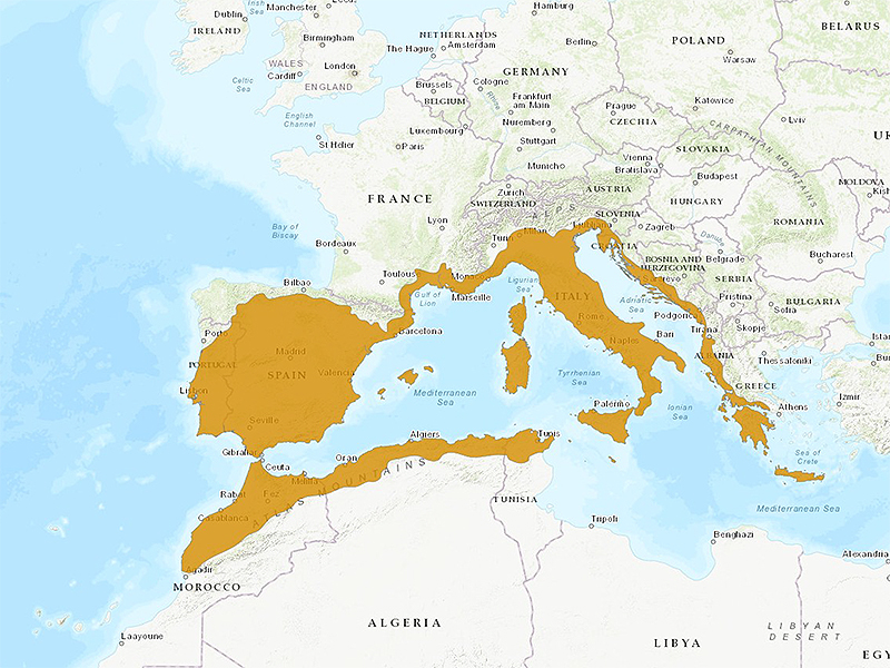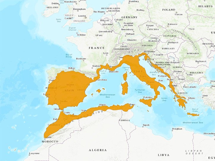 Es un insecto de distribución mediterránea, presente en toda la cuenca europea y en los paises del magreb. En muchos lugares presenta dos generaciones al año, y en la península hay zonas en las que se puede encontrar durante todo el año, por lo que probablemente también presente dos generaciones en muchas áreas.
