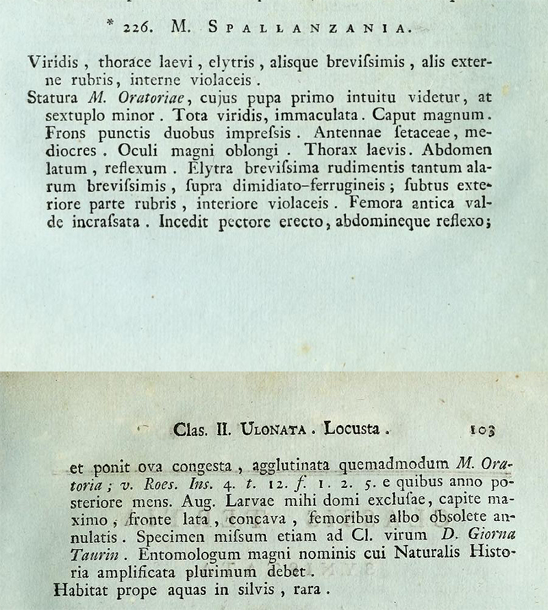 La especie fue descrita en 1792 por el naturalista italiano Pietro Rossi en su obra Mantissa insectorum, exhibens species nuper in Etruria, como Mantis spallanziana.