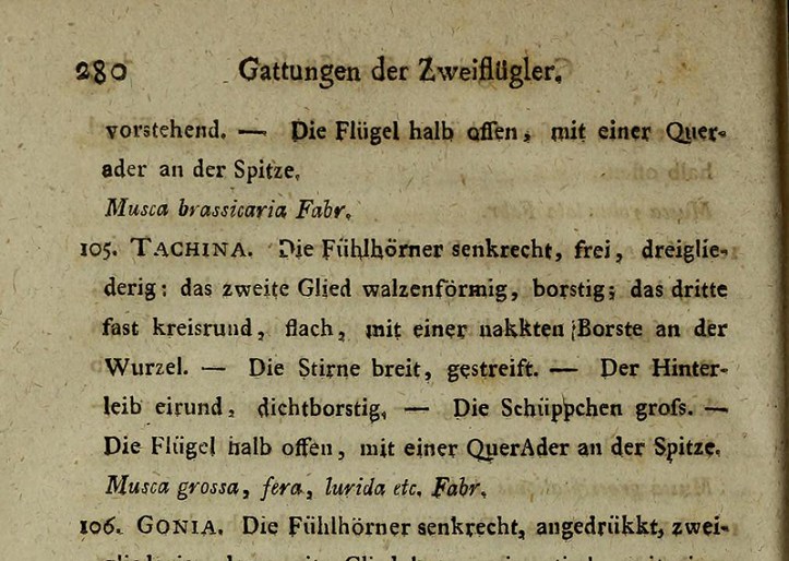 [Traducción][105. TACHINA. Las antenas son verticales, libres y trilobuladas: el segundo segmento es cilíndrico y erizado; el tercero es casi circular, plano, con una cerda desnuda en la base. La frente es ancha y rayada. El abdomen es ovalado y densamente erizado. Las caliptras son grandes. Las alas están semiabiertas, con una vena transversal en la punta. Musca grossa, fera, lurida, etc., Fabr.]