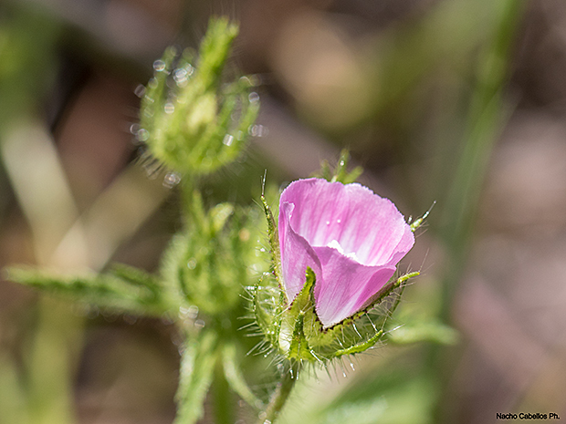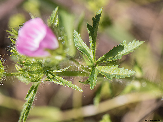 (Sinin. Althaea hirsuta L.) Planta anual perteneciente a la familia Malvaceae , con hojas palmatilobadas con entre tres y cinco foliolos, dentadas y pilosas por ambas caras. Las flores tienen la corola púrpura, con los pétalos rosado azulados o malva claro, sépalos y epicáliz pilosos. Es una planta que no suele levantar más de medio metro del suelo.